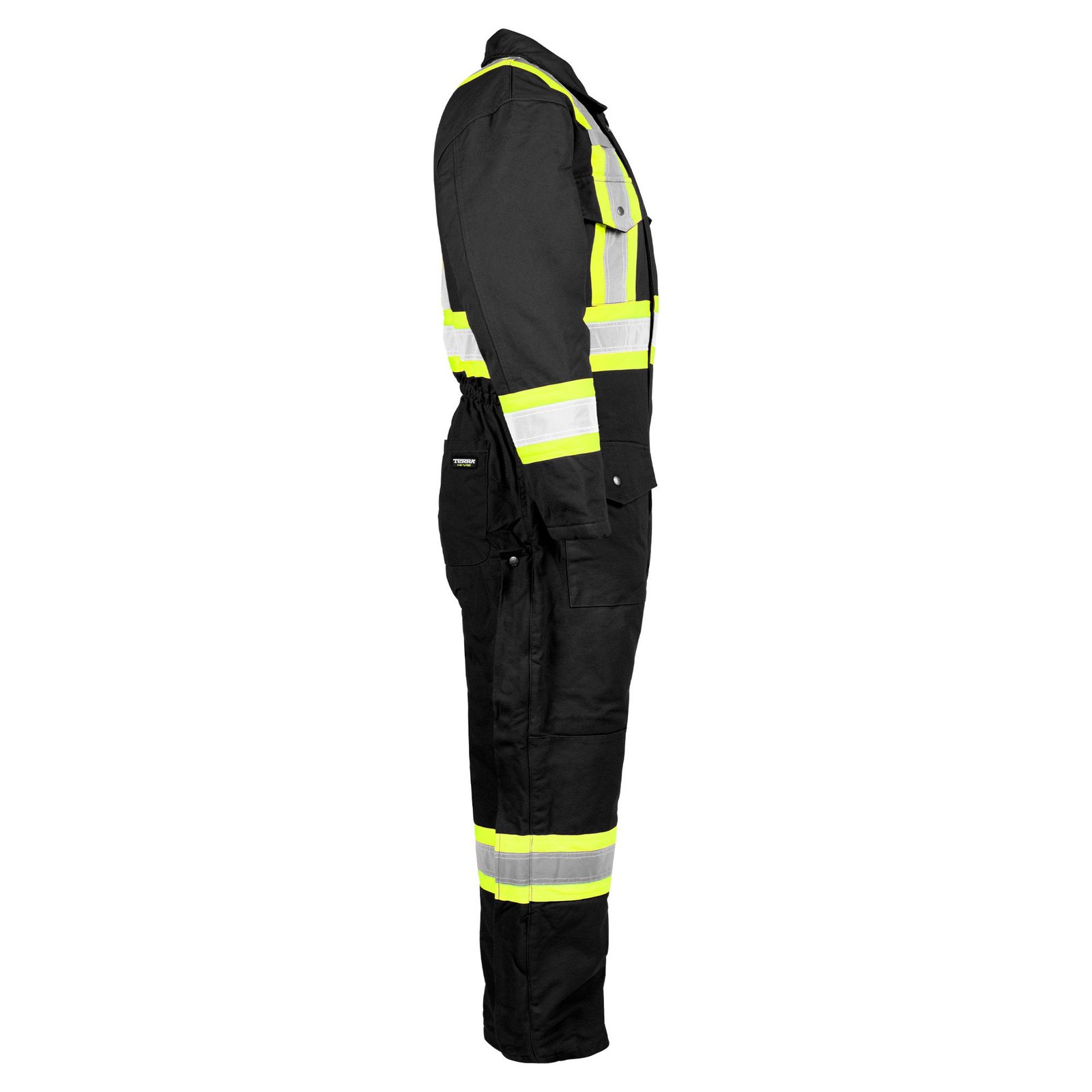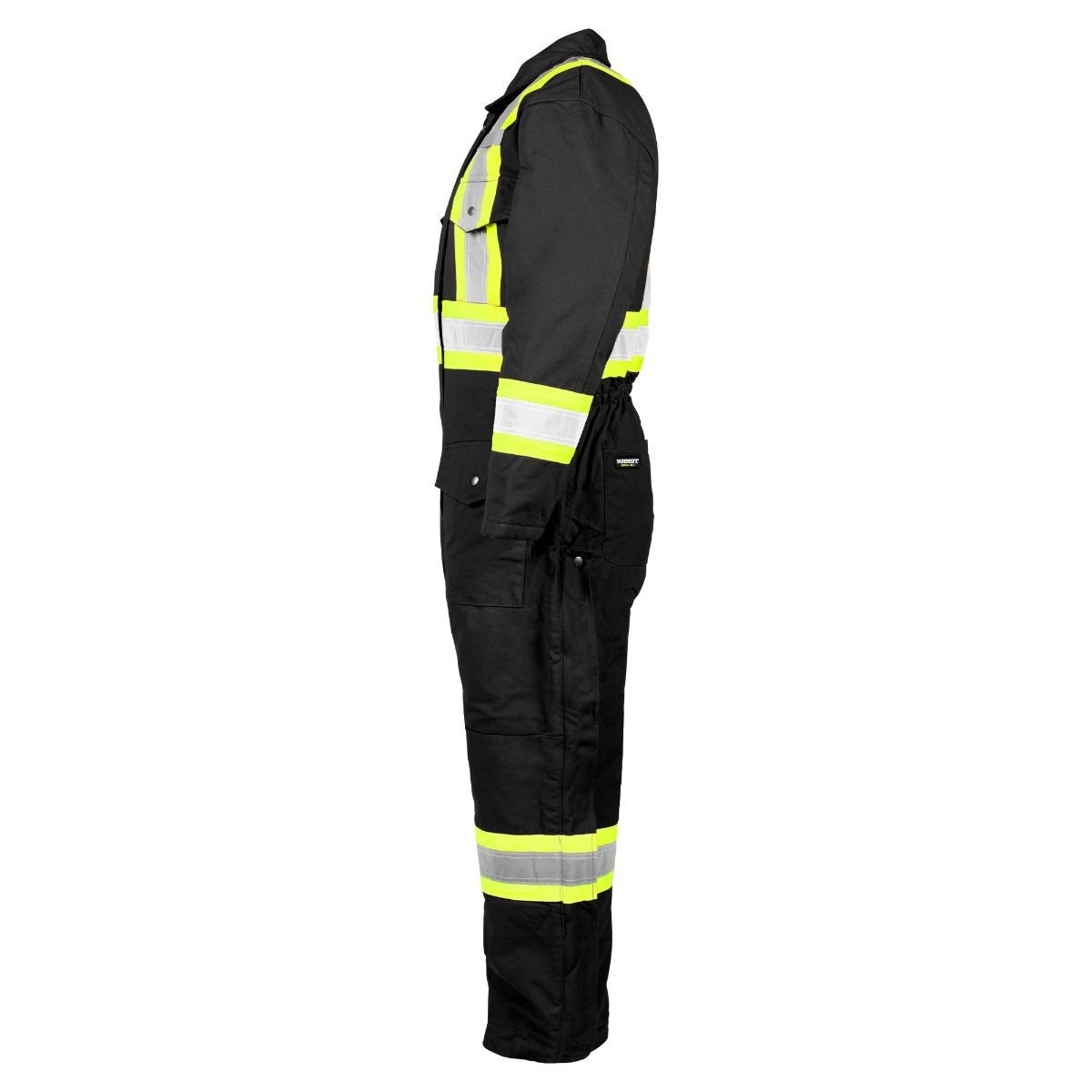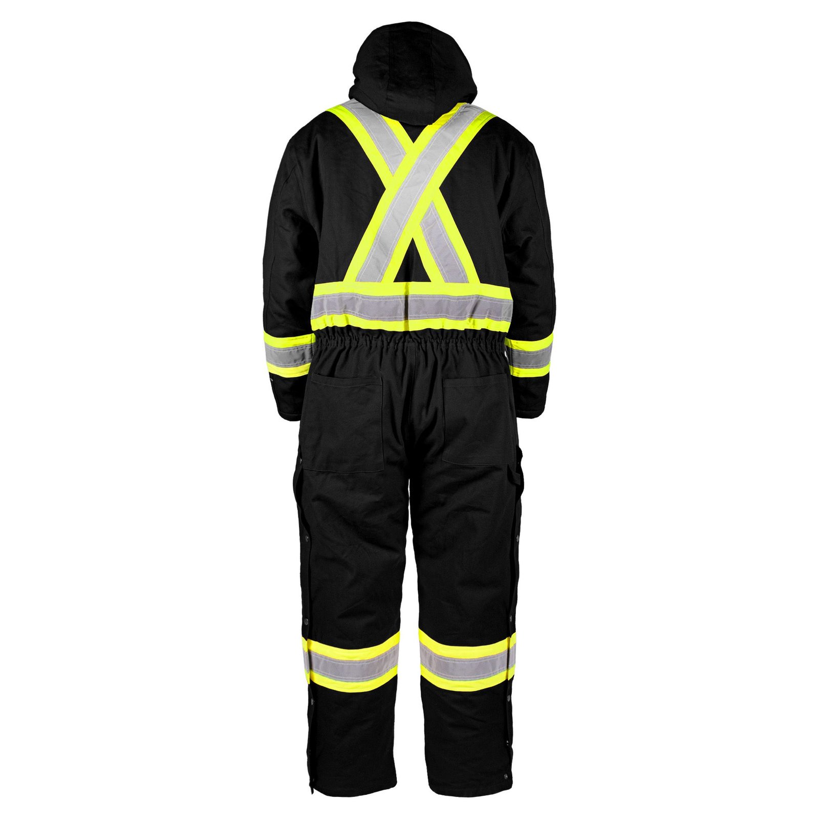 Made from cotton canvas, these high-visibility coveralls are lined and insulated to keep you nice and warm in the harshest winter conditions. Their reflective tape over contrast stripes ensures your visibility in all situations. The detachable and adjustable hood with two levels of snaps lets you accommodate a hard hat. The rib knit cuffs inside the sleeves keep out the cold and debris. In addition to two microphone loops, they are also equipped with several pockets.